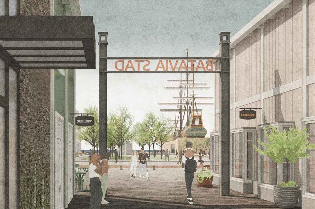 Die Entwurfsskizze für das neu gestaltete Museum Batavialand ist fertig. Darin wird das Schiff Batavia einen prominenten Platz an Land in der Mitte des Museumsgeländes erhalten. Auch für das neue Eingangsgebäude, die Ausstellungsräume und die Werkstätten wurde ein erster Entwurf erstellt. Alles wird eine Einheit bilden, mit dem Boden als verbindendes Element. Diese Skizze ist der erste Schritt im Entwurfsprozess, der in den kommenden Monaten zu einem vorläufigen Entwurf weiterentwickelt wird.